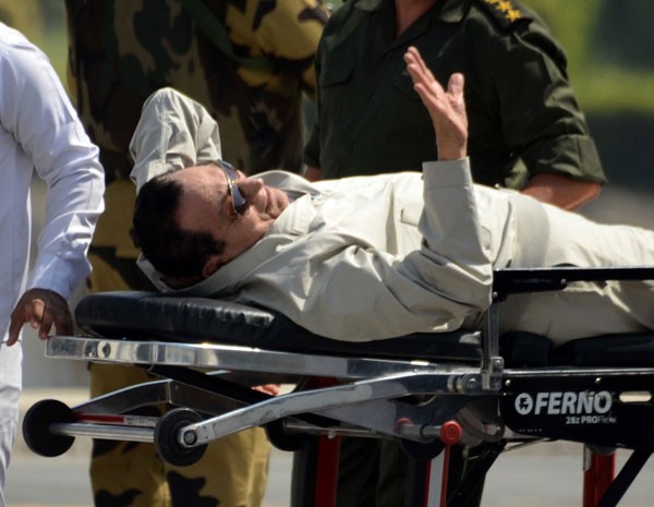 Transportado em uma maca, de um helicóptero militar para o hospital militar do Cairo após seu julgamento. O ex-líder foi ao tribunal pela segunda vez desde que foi solto da prisão de Tora para enfrentar o julgamento de acusações, entre elas a de cumplicidade no assassinato de manifestantes durante a rebelião popular de 2011 que o depôs.